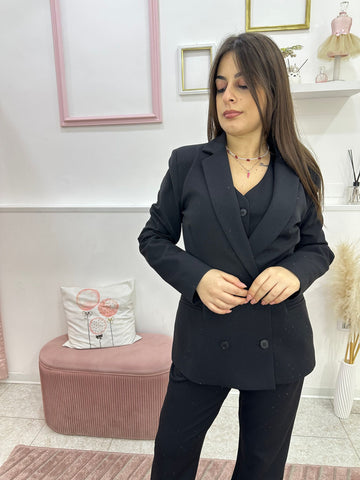 Tailleur smanicato Lunghezza: gilet regular, pantalone lungo Scollo: a V Modello gilet: brillantini tono su...