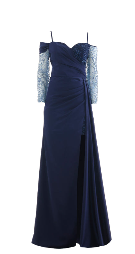 - Dettagli: maniche in pizzo, spacco laterale, drappeggio sul fianco