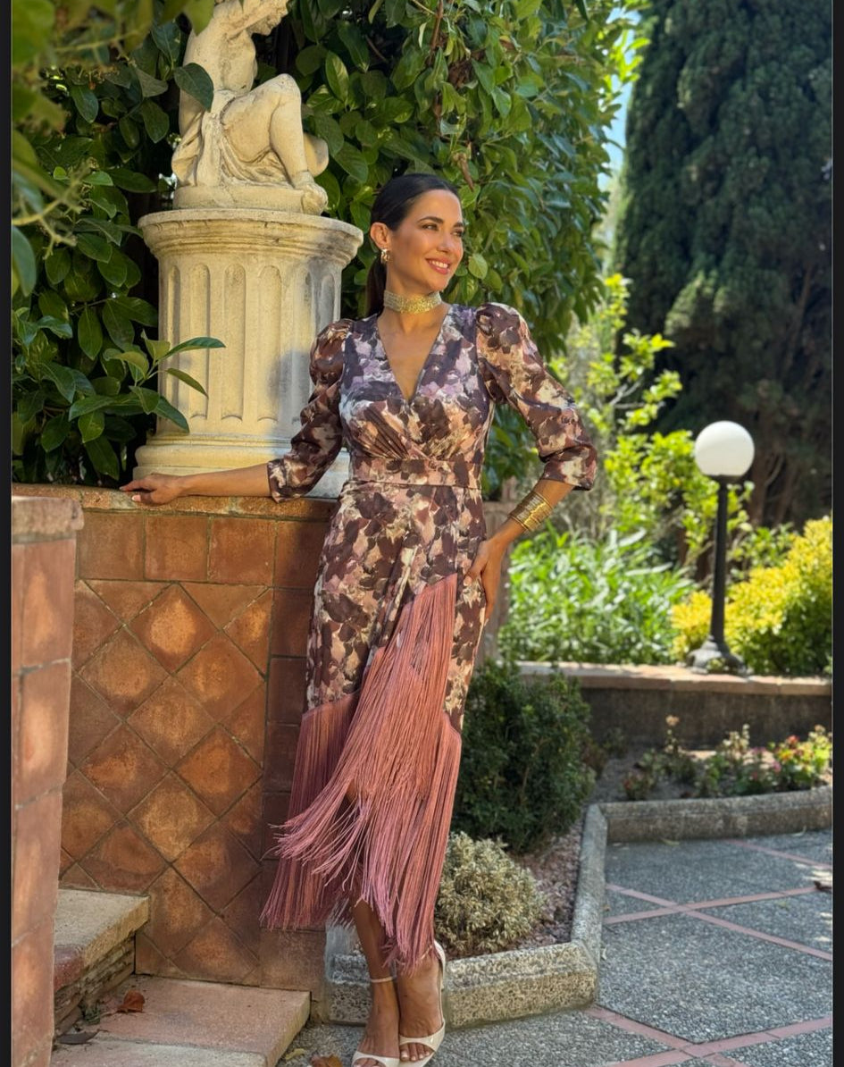 - Modello : Tubino con gonna a frange sfalsate, manica 3/4 a sbuffo.