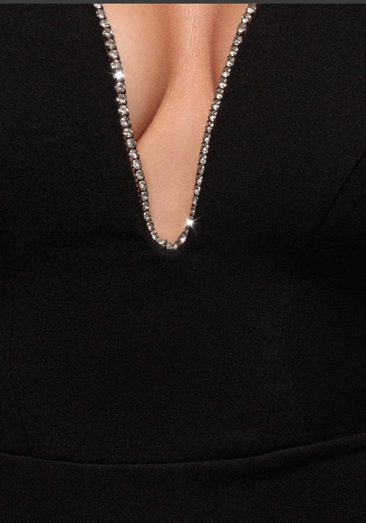 - Modello : Tubino in tessuto che valorizza la silhoutte ,scollo profondo con dettagli di piccoli punti luce.