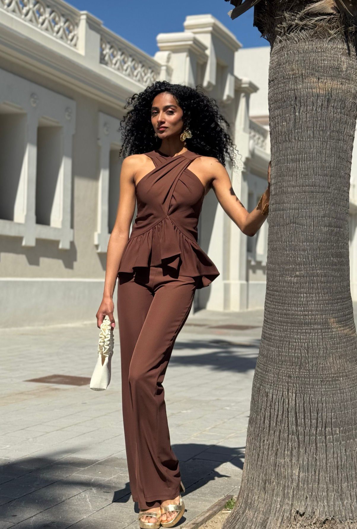 - Modello :top incrociato con balza in vita, pantalone dritto