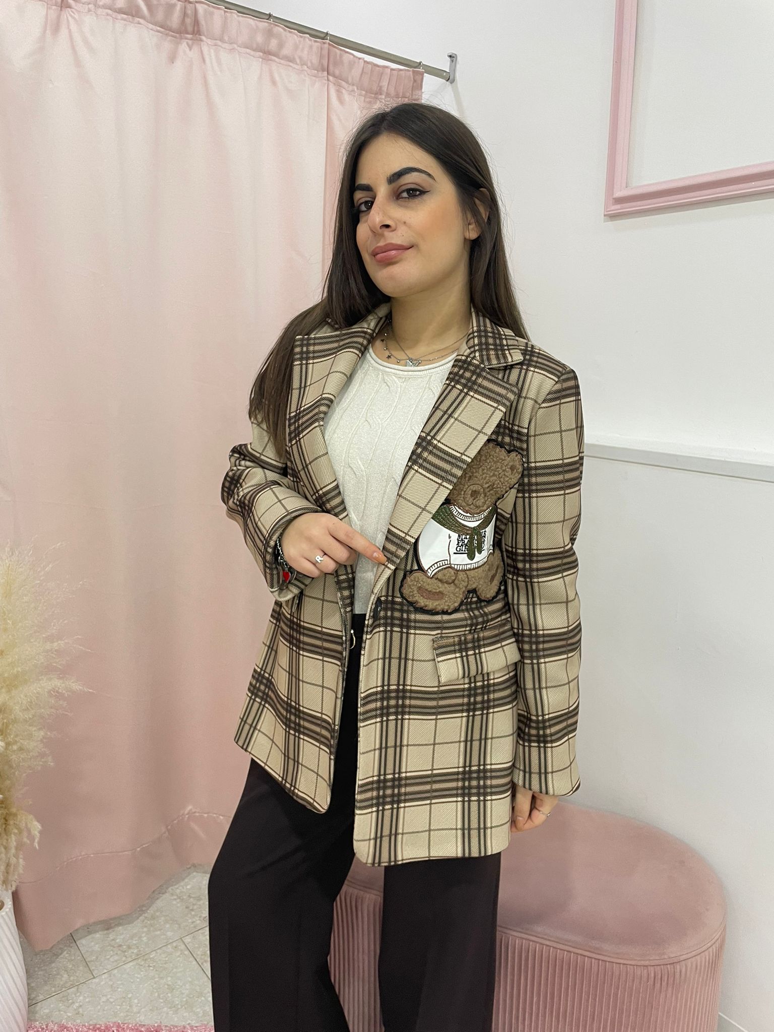 dettagli: tessuto effetto tartan con applicazione teddy in 3D, tasche con patta chiusura: aperta