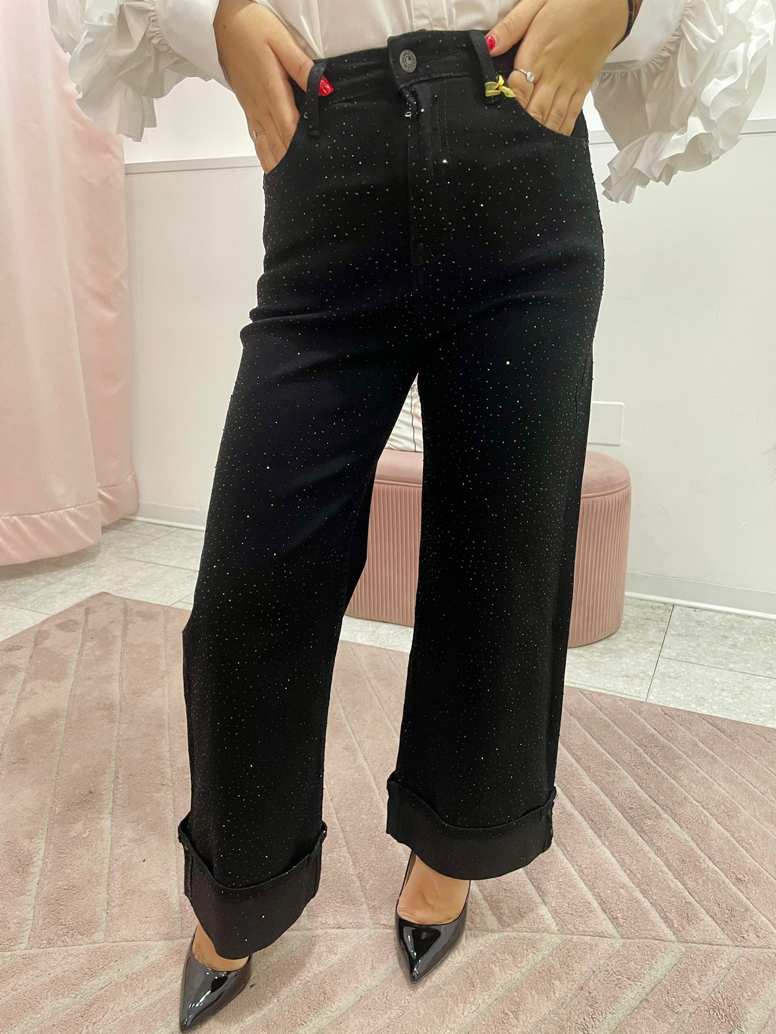 Modello gamba larga, con zip e bottone, piegone nella parte bassa