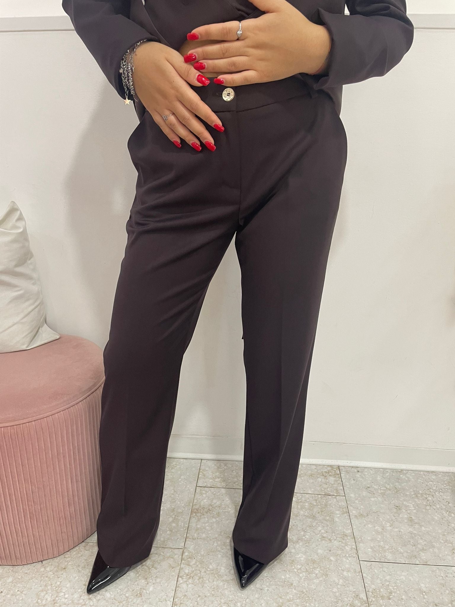 pantalone a zampa con zip e bottone, piega stirata centrale.