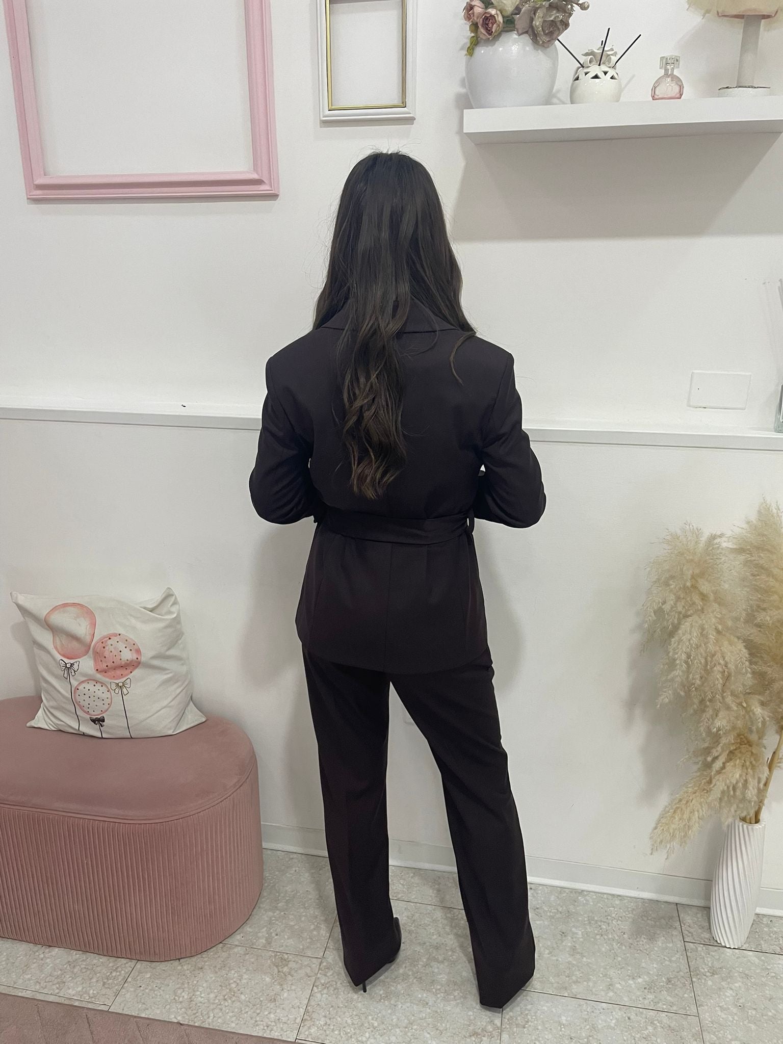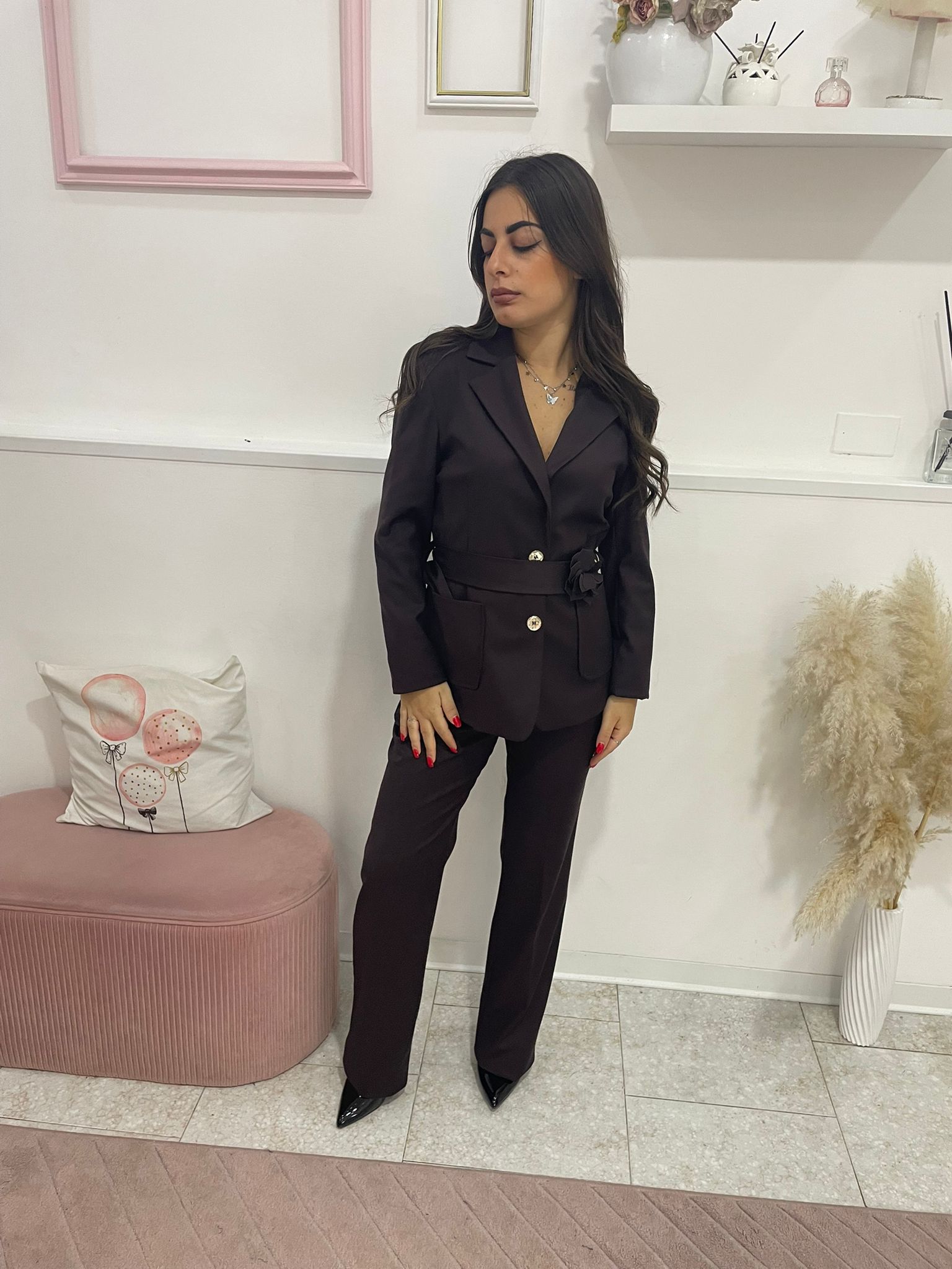 - Modello giacca: due bottoni con cintura in tessuto da annodare, tasche laterali alla giacca.